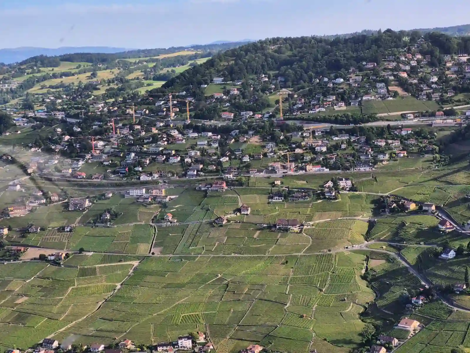 Während des Flugs lassen sich die typischen Dörfer von Lavaux erkennen, eingebettet zwischen Weinbergen und See. Sie verleihen der Landschaft ihren kulturellen Charakter.